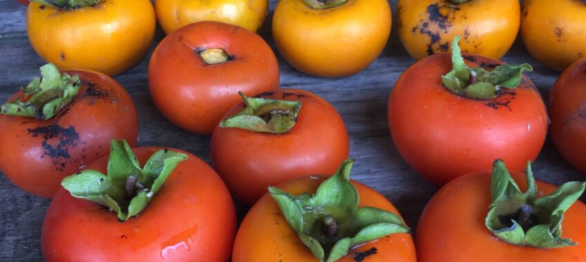 Diospyros virginiana, persimmon, is an edible sweet, slightly tangy fruit with a soft to occasionally fibrous texture.