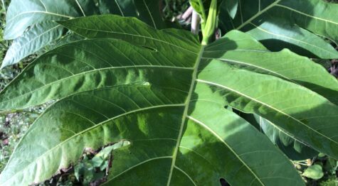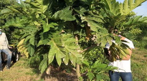 Artocarpus altilis, breadfruit is a dietary staple in many tropical areas. Baking it enhances its natural flavor.